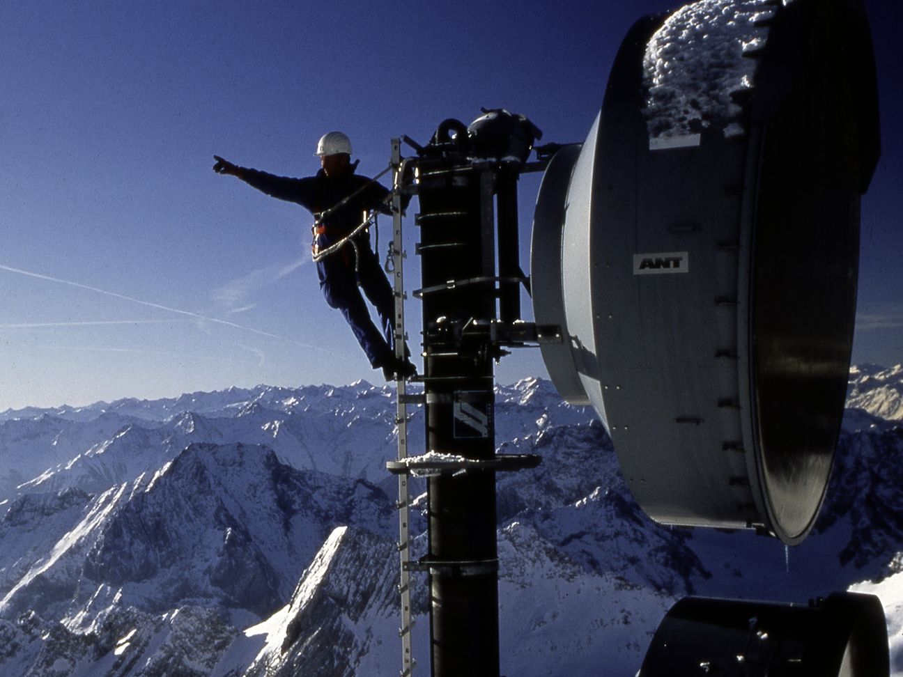Ein Techniker klettert auf dem Funkmast an der Zugspitze. Er sorgt dafür, dass Handys ein gutes Netz haben.