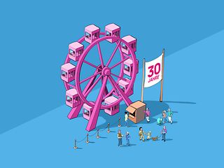 Ein Riesenrad und eine Fahne, auf der steht: 30 Jahre.