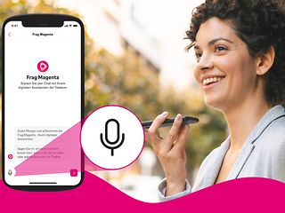 Frau spricht mit "Frag Magenta" über ihr Smartphone.