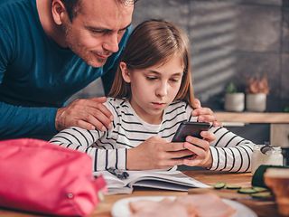 Vater mit Tochter schauen auf ein Handy