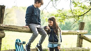 Ein Junge und ein Mädchen draußen in der Natur. Beide tragen die Smartwatch Anio 6 am Handgelenk.