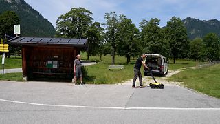 Hand hält analoge Stoppuhr. Im Hintergrund eine Baustelle mit Arbeitern