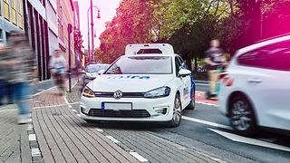 Fahrzeug fährt im Stadtverkehr während Passanten und andere Verkehrsteilnehmende unterwegs sind.