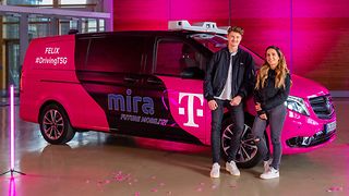 Zwei Content-Creator treten gegeneinander an: Auf dem Messe-Gelände in Hannover steuern sie einen Kleinbus mit 5G aus der Ferne.