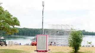 Das Bild zeigt ein offizielles Testsiegel von CHIP neben einer Mobilfunkanlage der Telekom.