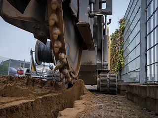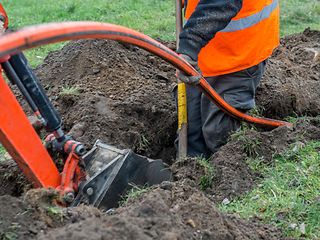 Baubegleiter der Telekom überprüft die Fortschritte an Glasfaser-Baustelle.