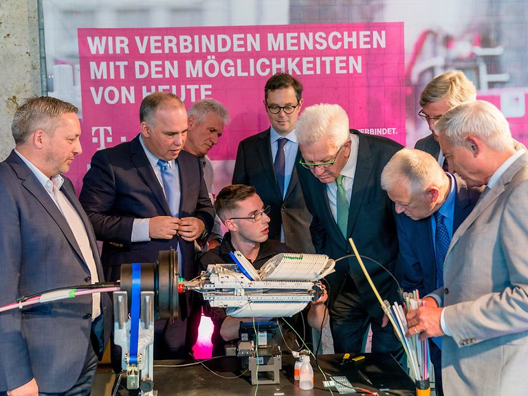 Beim Spleißen beweist Telekom-Techniker Sven Bühler eine ruhige Hand. Auch Baden-Württembergs Ministerpräsident Winfried Kretschmann macht ihn dabei nicht nervös.