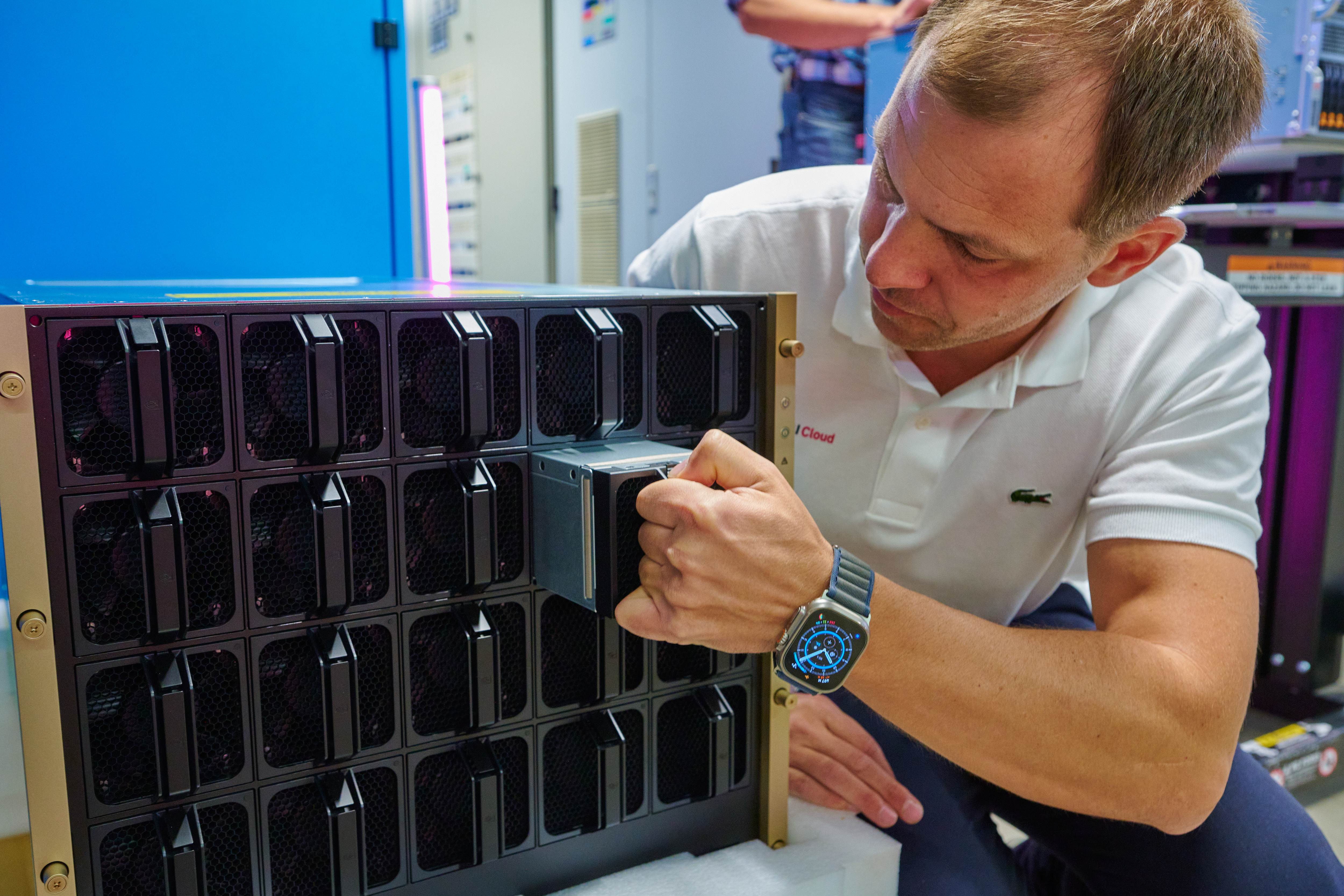 Christian Kotulek, Senior Product Manager Industrial AI Cloud zieht einen Lüfter aus der GPU.