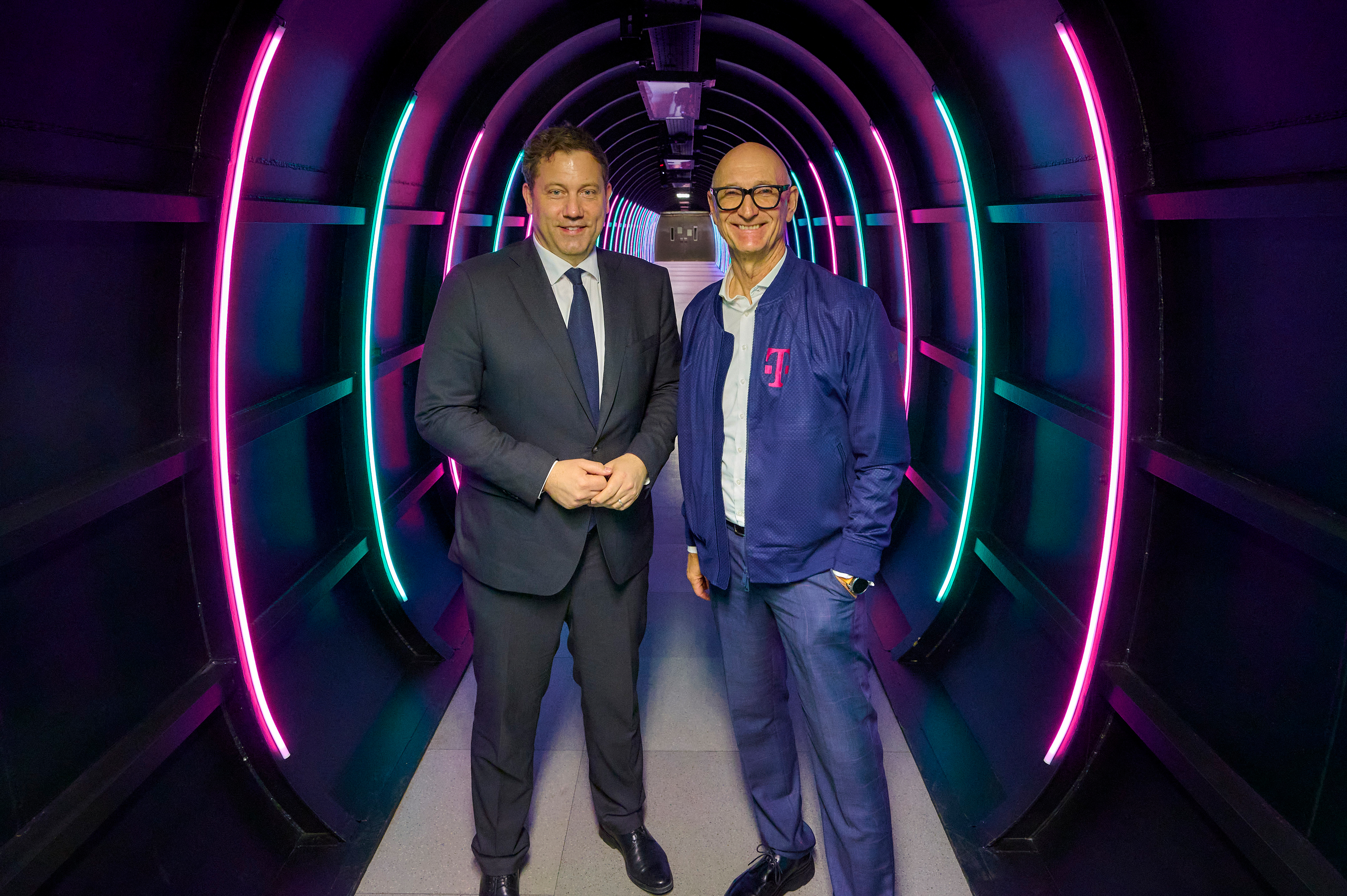 v.l. Rodrigo Diehl, (Geschäftsführer Deutschland), Tim Höttges (CEO Deutsche Telekom), Ferri Abolhassan (CEO T-Systems und Vorstandsmitglied DTAG) im Tunnel zur KI-Fabrik.