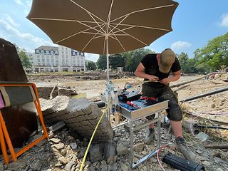 Telekom Techniker repariert zerstörte Kabel in Bad Neuenahr.
