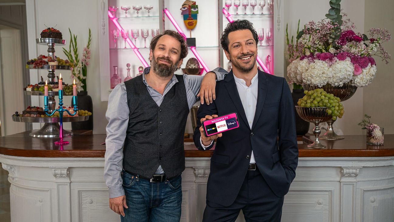 Fahri Yardim und Christian Ulmen freuen sich über das beste Angebot für Fernsehen und Streaming. © Deutsche Telekom