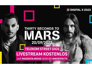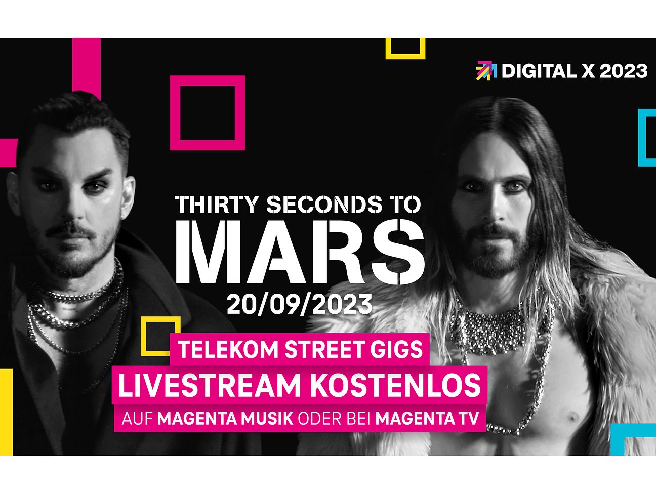 Exklusive Premiere: Die Telekom holt Thirty Seconds to Mars am 20. September auf die Digital X-Bühne. Die US-amerikanische Multi-Platin-Band um Sänger und Oscar-Preisträger Jared Leto und Schlagzeuger Shannon Leto wird im Kölner MediaPark spielen. Die US-Superstars präsentieren im Rahmen der Weltausstellung der Digitalisierung sowohl Fan-Favoriten als auch Songs des neuen Albums „It's The End Of The World But It's A Beautiful Day“. Fans können den einzigartigen Auftritt zu Hause und unterwegs als kostenlosen Livestream auf MagentaMusik und auf den entsprechenden Social-Media-Kanälen verfolgen oder bei MagentaTV, Kanal 141 bei Standardbelegung, und beim Sender #dabeiTV.