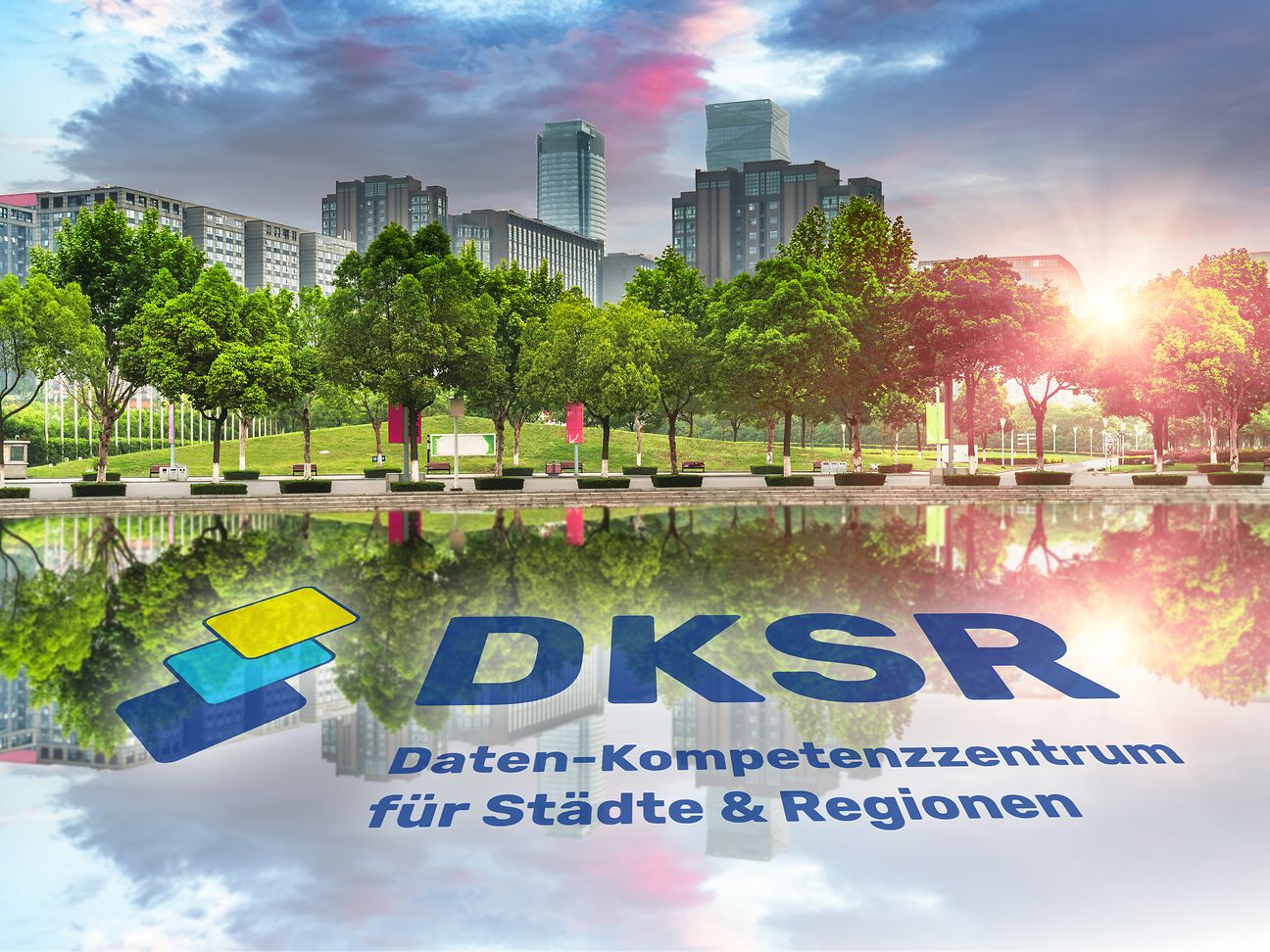 Kollage Stadtlandschaft und Logo Datenkompetenzzentrum für Städte und Regionen - DKSR.