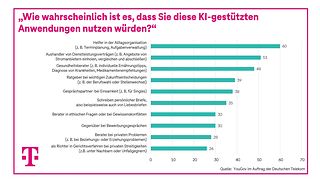 Ähnlich dankbar wären die Menschen für Hilfe beim Aushandeln von Verträgen, z.B. beim Stromanbieter. Fast die Hälfte aller Befragten können sich das vorstellen. Fast genauso viel Zustimmung (47 Prozent) findet ein KI-basierter Gesundheitsberater. Und selbst als Gesprächspartner in Zeiten von Einsamkeit würde KI akzeptiert (40 Prozent).