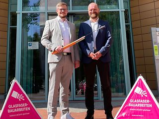 Fast 4.400 Wohnungen der Wohnungsgenossenschaft Marzahner Tor in Berlin bekommen Glasfaser von der Telekom. Maximilian Schnelle, Gebietsmanager Glasfaser Wohnungswirtschaft der Telekom, und Manuel Karasch, Vorstand der Wohnungsgenossenschaft Marzahner Tor (v.l.n.r.), haben die Vereinbarung jetzt unterschrieben. © Deutsche Telekom