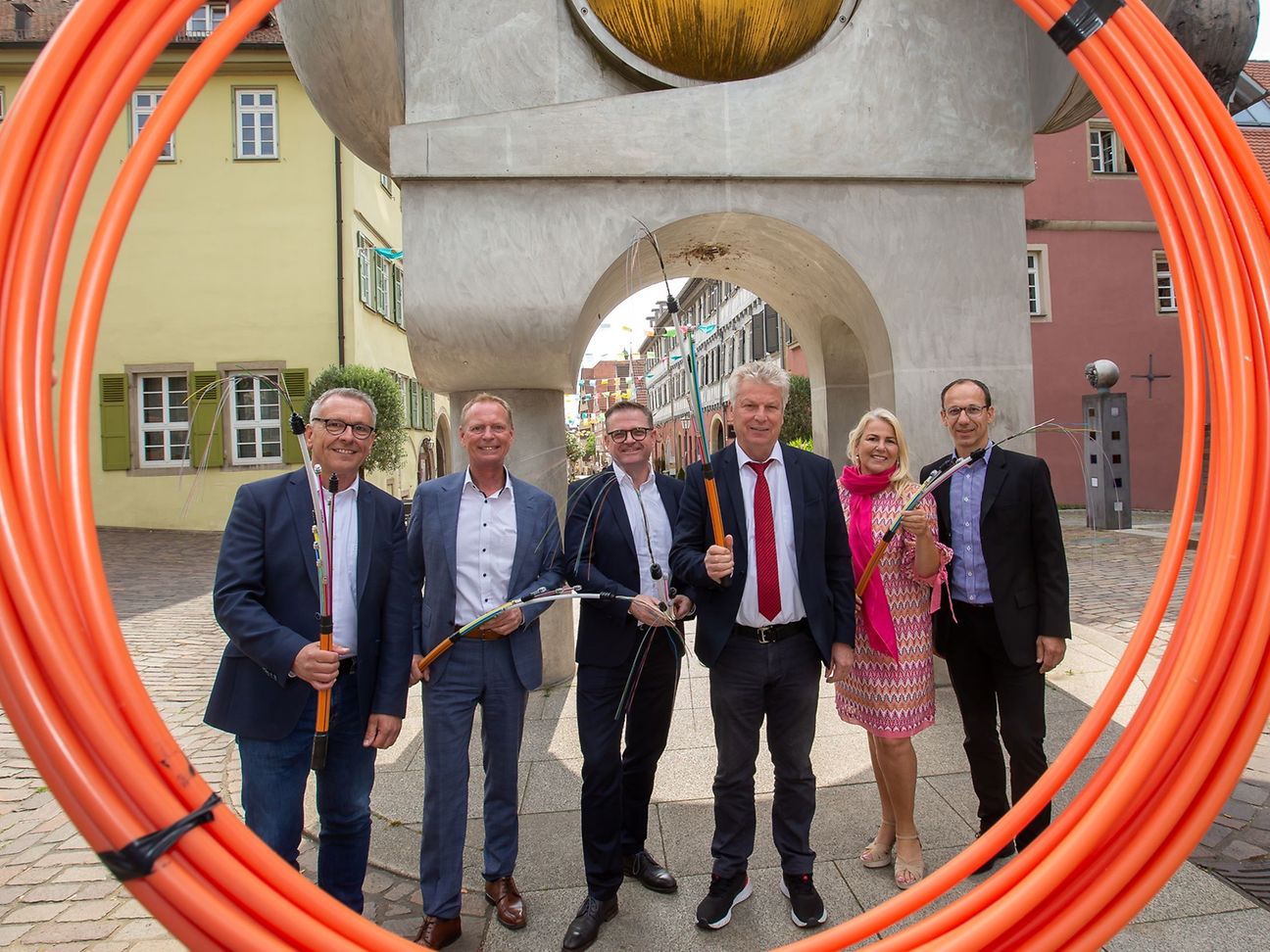 Von Erster Bürgermeister Michael Hanus, Stadtwerke-Geschäftsführer Richard Mastenbroek, Thilo Höllen (Deutsche Telekom), OB Jürgen Kessing, Sabine Wittlinger, Konzernbevollmächtigte Region Südwest der Telekom, und Lars Brackschulze von der Gigabit-Region der Telekom. © Alfred Drossel