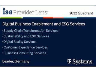 Im Survey „Digital Business Enablement und ESG Services 2022“ erzielte T-Systems den maximal möglichen Erfolg der Einstufung als Leader in sämtlichen Kategorien „Digital Business Consulting Services“, „Digital Supply Chain Transformation Services“, „Digital Customer Experience Services“, „Sustainability and Decarbonization Services“ sowie „Digital Reality Services“. Im Bereich „Digital Business Consulting“ betonte ISG vor allem die Integration der Beratungskompetenzen von Detecon in das Gesamtportfolio von T-Systems, wodurch Kunden von der Beratung über die Entwicklung von Lösungen bis hin zur vollständigen Integration alle Leistungen aus einer Hand erhalten können. Dies beschleunigt etwa die Umsetzung digitaler Strategien und Lösungen durch schnelle Prototypen und Proof of Concepts (PoCs).