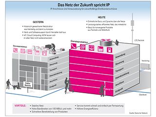 Um den Kunden Sprachtelefonie und Bandbreiten mit Übertragungsraten von 100 Mbit/s und mehr anbieten zu können, setzt die Telekom auf das Internet-Protokoll (IP). Damit steuert sie ihre Netzinfrastruktur. Nur mit IP Technologie sind Kundenanschlüsse fit für die Zukunft. Das war mit den alten ATM- und GbE-Plattformen nicht mehr zu machen. ATM steht für „Asynchronous Transfer Mode“ und GbE steht für Gigabit Ethernet. Beides beschreibt Formen, wie die Daten übermittelt wurden. Über diese Plattformen liefen die DSL-Anschlüsse im alten ISDN-Netz. Für Weiterentwicklungen sind sie nicht mehr leistungsstark genug und zudem wartungsanfällig. Ersatzteile sind immer schwerer zu beschaffen.