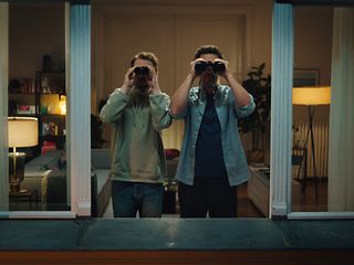 Christian Ulmen und Fahri Yardim schauen mit Ferngläsern aus einem Fenster