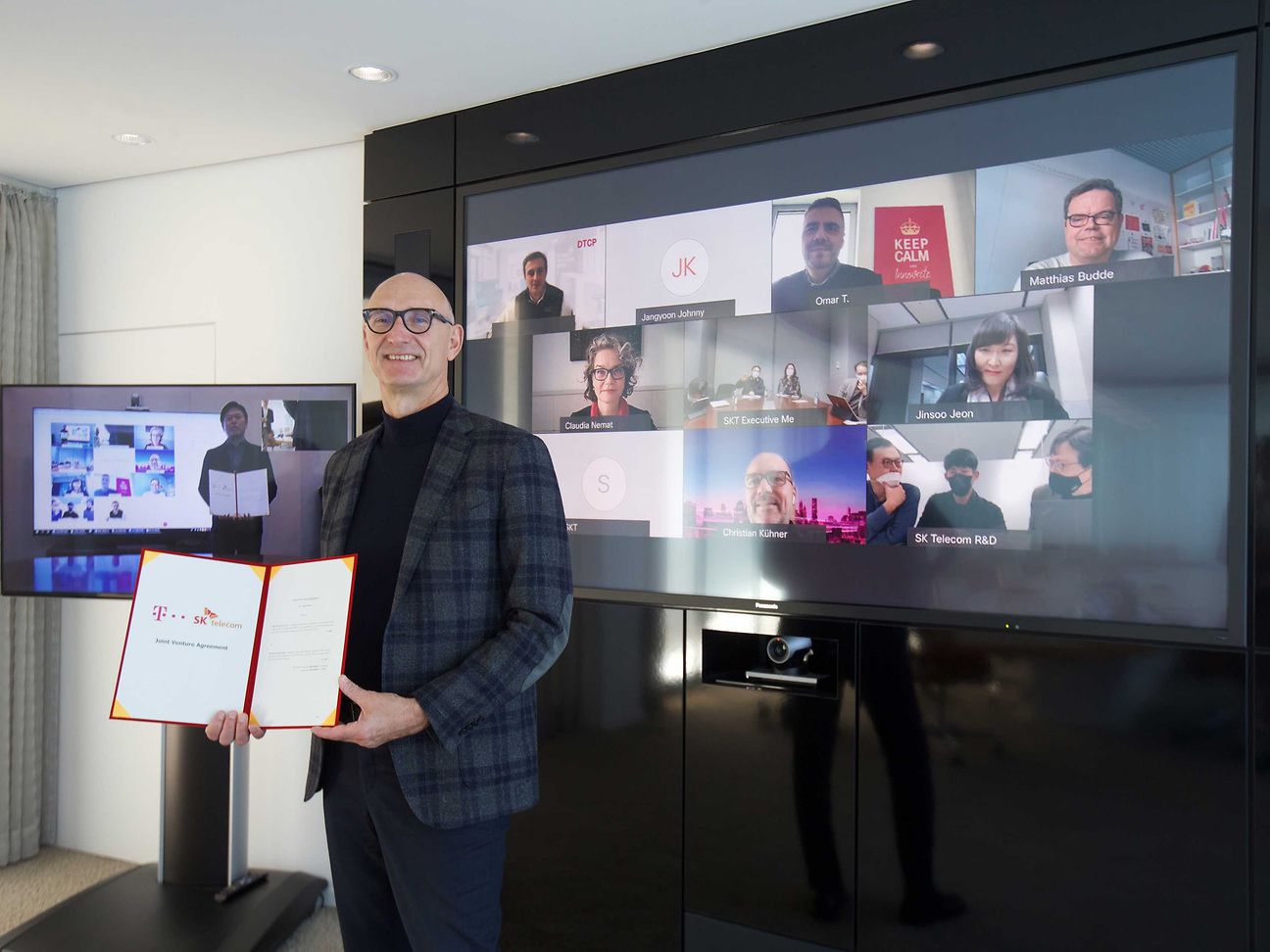 Tim Höttges, CEO Deutschen Telekom und Park Jung-ho, CEO SK Telecom und ihre Teams bei einer gemeinsamen Videokonferenz.