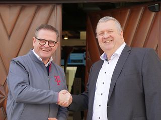 Thilo Höllen, Leiter Breitbandkooperationen Telekom Deutschland (links) und Volkmar Klaußner, Geschäftsführer der Stadtwerke Nürtingen, bekräftigen die langfristig angelegte Zusammenarbeit. © Stadt Nürtingen
