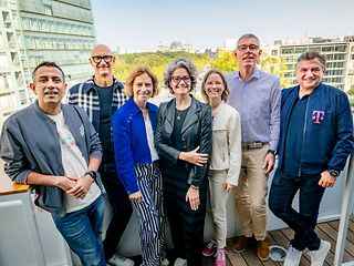Vorstandssitzung in der neuen Magenta Mitte: (v. l.) Srini Gopalan, Tim Höttges, Dominique Leroy, Claudia Nemat, Birgit Bohle, Christian Illek, Ferri Abolhassan. © Deutsche Telekom