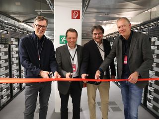 Eröffnung des Batteriegroßspeichers: Michael Hagspihl (Deutsche Telekom ), Volker Roßmann (Pixii), Bürgermeister Klaus Rosenau, Bernd Schulte-Sprenger (PASM). © Deutsche Telekom