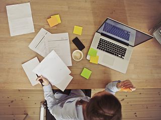 Arbeitsplatz Draufsicht mit Blättern und Laptop