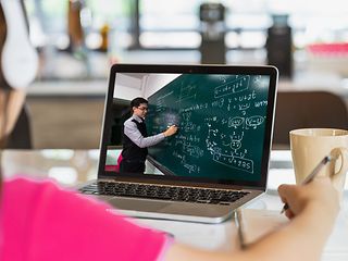 Kind sitzt mit Laptop am Tisch. Im Laptop ist zu sehen, wie ein Lehrer an der Tafel per Livestream unterrichtet.