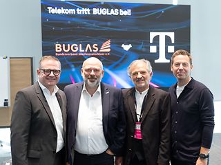 Gemeinsam stark für Glasfaser. Von links: Thilo Höllen, Leiter Breitbandkooperationen bei der Telekom; Patrick Helmes, BUGLAS-Vizepräsident und Glasfaser Ruhr-Geschäftsführer; Theo Weirich, BUGLAS Präsident; Wolfgang Metze, Geschäftsführer Privatkunden Telekom Deutschland © Deutsche Telekom