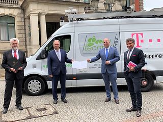 Feierliche Unterzeichnung des Digitalpakts Sachsen-Anhalt in Magdeburg: Ministerpräsident Reiner Haseloff (2.v.l.) mit Telekom Deutschland-Chef Dirk Wössner (2.v.r.) vor dem neuesten Vermessungsfahrzeug der Telekom. Damit startet die Telekom heute die Vorbereitungen für den Glasfaserausbau in Magdeburg. Umrahmt von Wirtschaftsminister Armin Willingmann (links) und Telekom Deutschland Service-Chef Ferri Abolhassan (rechts).