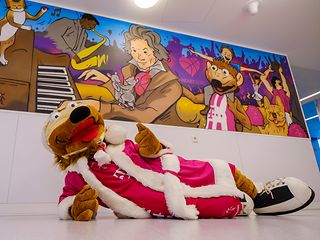 Zur Einweihung der Kunstflächen kam der beliebte Maskottchen-Löwe der Telekom Baskets Bonn auf das Universitätsgelände. Bonni überreichte Alltagsmasken in Kindergröße mit Baskets-Motiv als Geschenk für die jungen Patienten der Kinderherzmedizin-Station. Zudem erhielten sie als Andenken einen flauschigen Mini-Bonni aus Plüsch und auch Schoko-Nikoläuse durften nicht fehlen. „Wir hoffen, mit den Kunstflächen und der kleinen Überraschung gerade in dieser schwierigen Zeit ein Lächeln auf die Gesichter der Kinder zaubern zu können“, sagt Wolfgang Wiedlich, Präsident der Telekom Baskets Bonn.