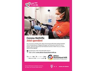Der Zusammenschluss deutscher Hilfs­organisationen leistet bei Katastrophen und Notsituationen weltweit humanitäre Hilfe. Seit Beginn der Corona-Pandemie hat das Bündnis auch in Deutschland viele Hilfsprojekte für Menschen in Not gestartet. Neben der Aufklärung zählen im Kampf gegen COVID-19 vor allem die Versorgung mit Hygieneartikeln, Desinfektionsmitteln, medizinischer Ausrüstung und Medikamenten zu den wichtigsten Hilfsmaßnahmen. www.aktion-deutschland-hilft.de