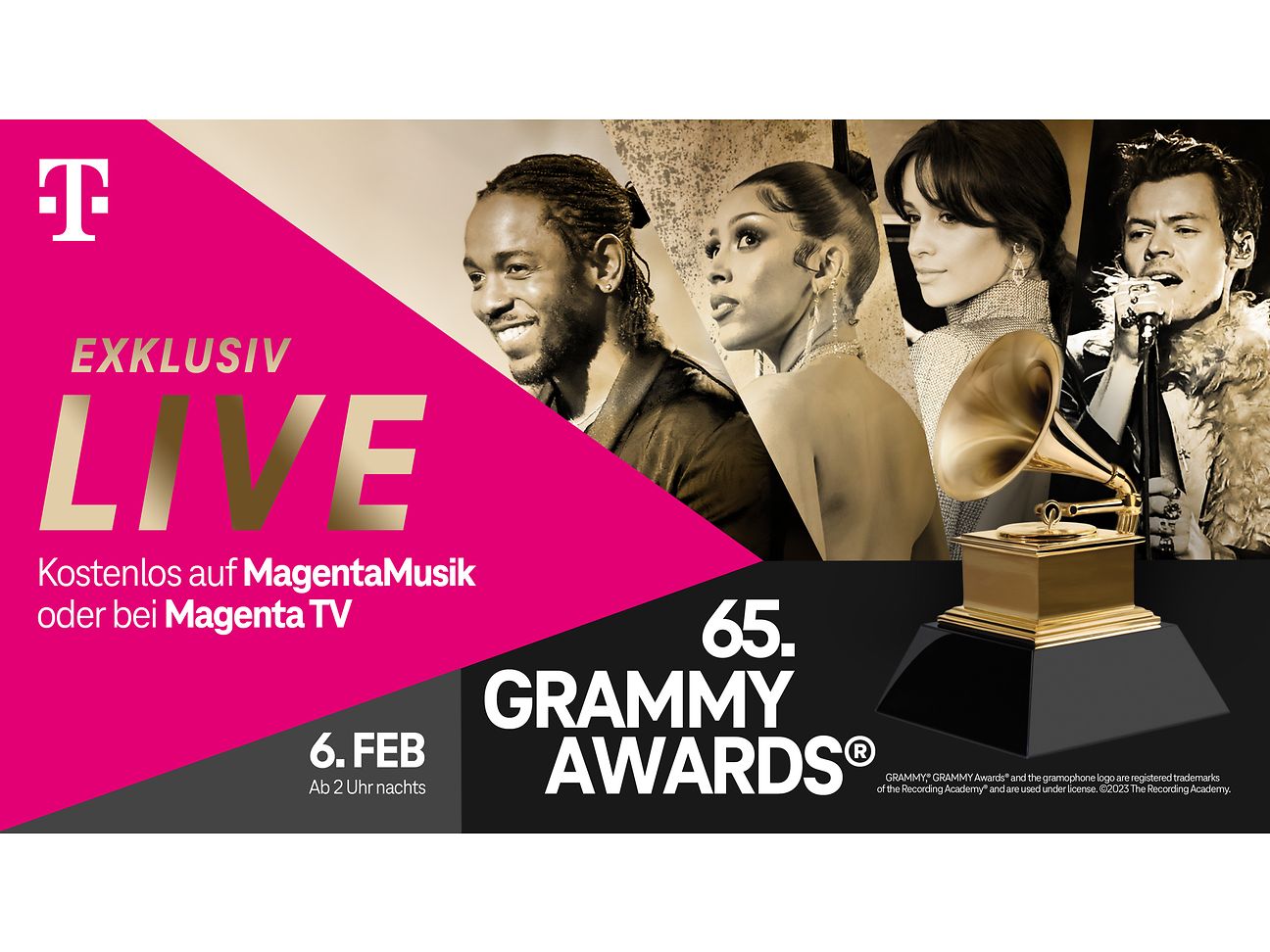 Die 65. GRAMMY Awards®, die von der Recording Academy® in Los Angeles verliehen werden, ehren die größten Stars der Stunde. Nominiert sind Künstler*innen wie Beyoncé, Adele, Kendrick Lamar und Harry Styles. Die Telekom zeigt den weltweit wichtigsten Musikpreis live und exklusiv am 6. Februar 2023 nachts ab 2 Uhr (MEZ) bei MagentaMusik sowie MagentaTV (Kanal 141 bei Standardbelegung). Eine Wiederholung gibt es am 6. Februar um 20:15 Uhr beim Sender #dabeiTV auf MagentaTV. Anschließend steht die Show zudem in der Megathek von MagentaTV und bei MagentaMusik bereit. Alle auftretenden Künstler*innen werden in Kürze bekannt gegeben.