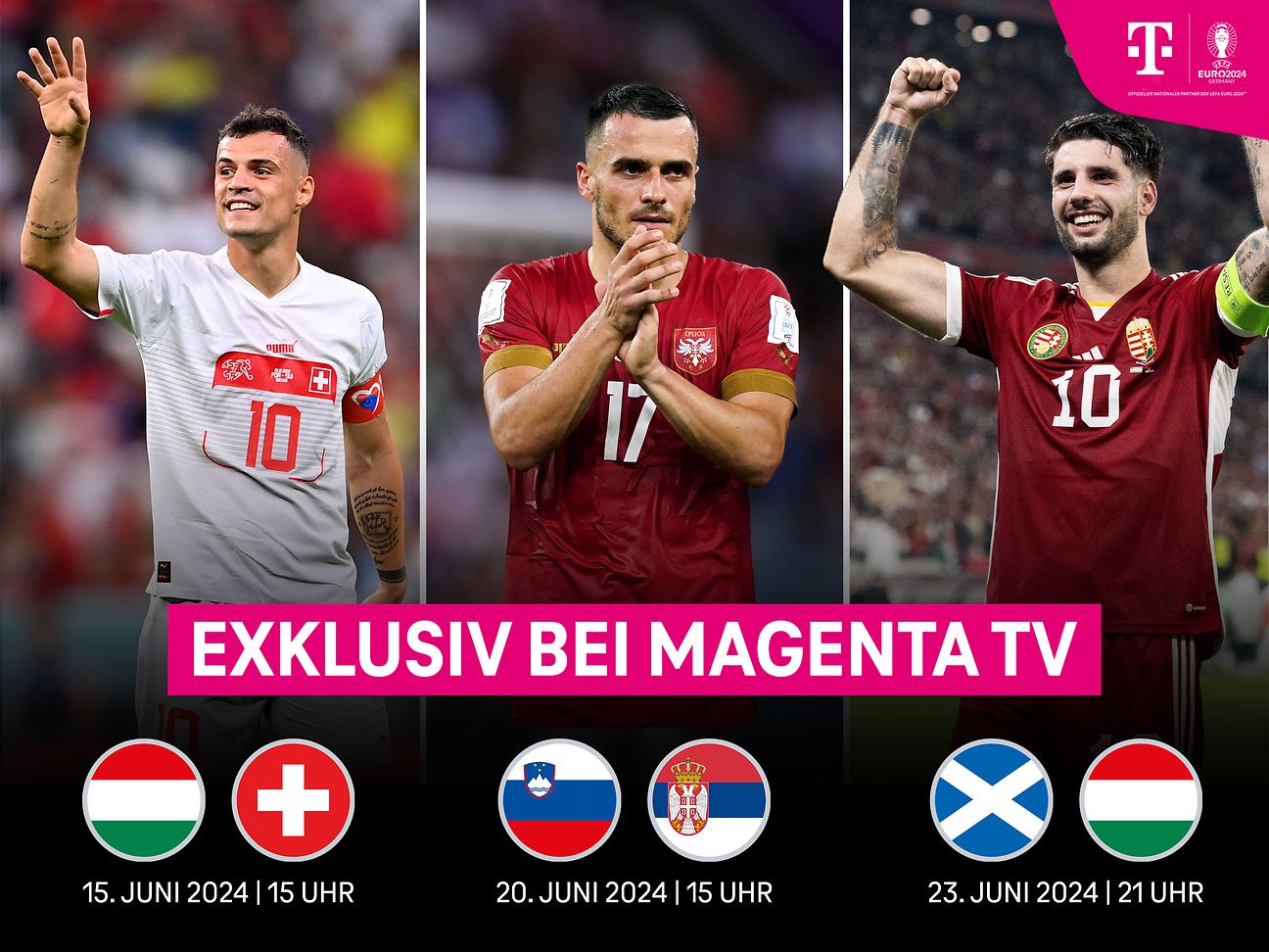 MagentaTV überträgt alle 51 Spiele der UEFA EURO 2024. Mit Ungarn gegen Schweiz, Schottland gegen Ungarn sowie Slowenien gegen Serbien stehen drei der fünf Exklusivspiele fest. © Deutsche Telekom