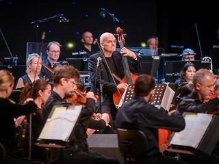 Das Bild zeigt den Jazz-Bassisten Lars Danielsson inmitten des Beethoven Orchester Bonn.