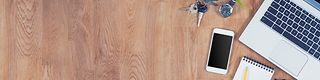 Tisch mit Handy, Laptop, Notizblock, Brille und Schlüsseln