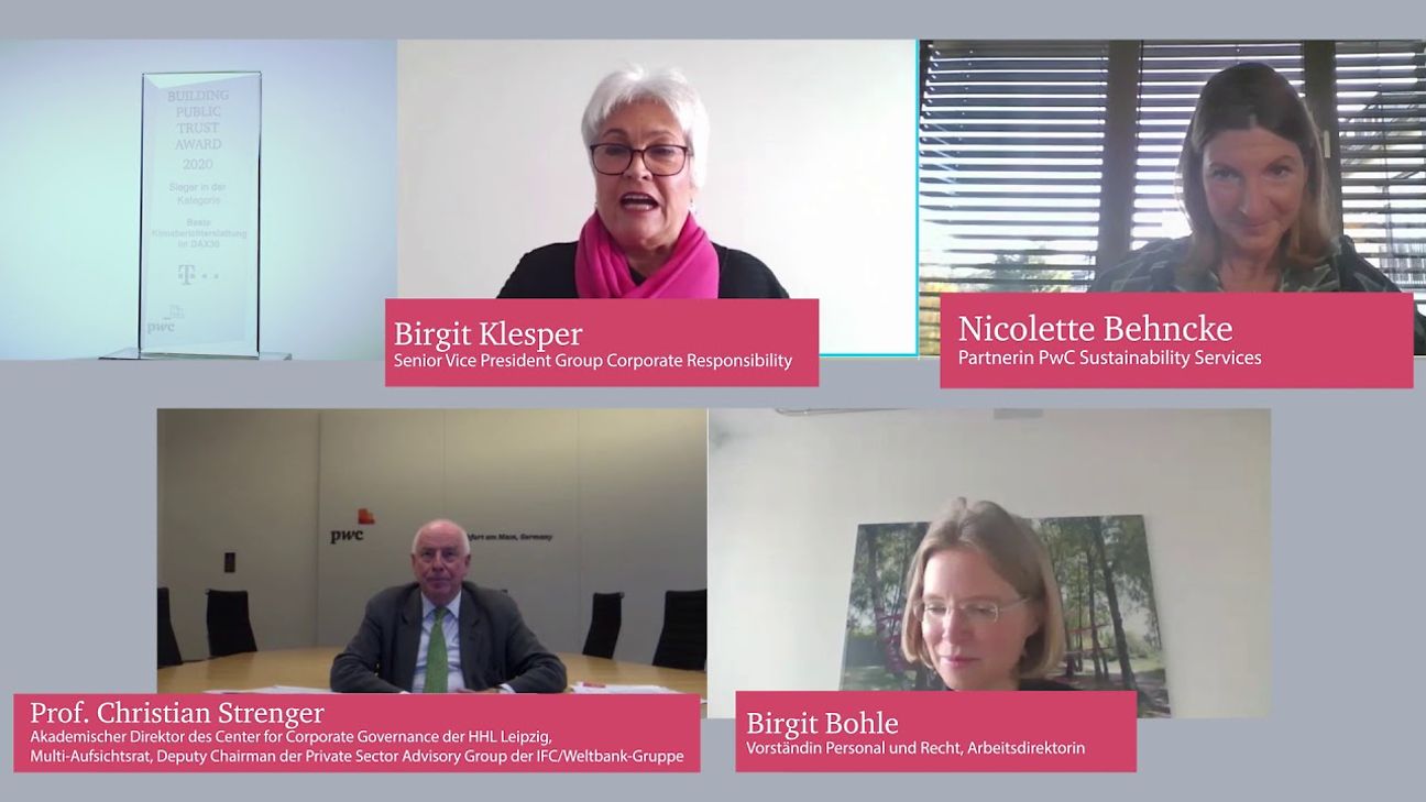Die Bedeutung des Klimawandels ist längst im Bewusstsein der Öffentlichkeit angekommen. Auch Investoren fragen zunehmend genau nach, wie es Unternehmen mit dem Klimaschutz halten: sind die Ziele ehrgeizig genug? Folgen großen Ankündigungen auch realistische Handlungen? Nach welchen Standards werden Emissionen erfasst und berichtet? Ist das Geschäftsmodell „klimasicher“, werden Risiken und Chancen systematisch analysiert und die Organisation entsprechend gesteuert? Eine wichtige Informationsquelle stellen dabei die Geschäfts- und Nachhaltigkeitsberichte der Unternehmen dar. Auf dieser Basis hat PwC die Deutsche Telekom als bestes DAX30 Unternehmen mit dem Building Public Trust Award 2020 ausgezeichnet.