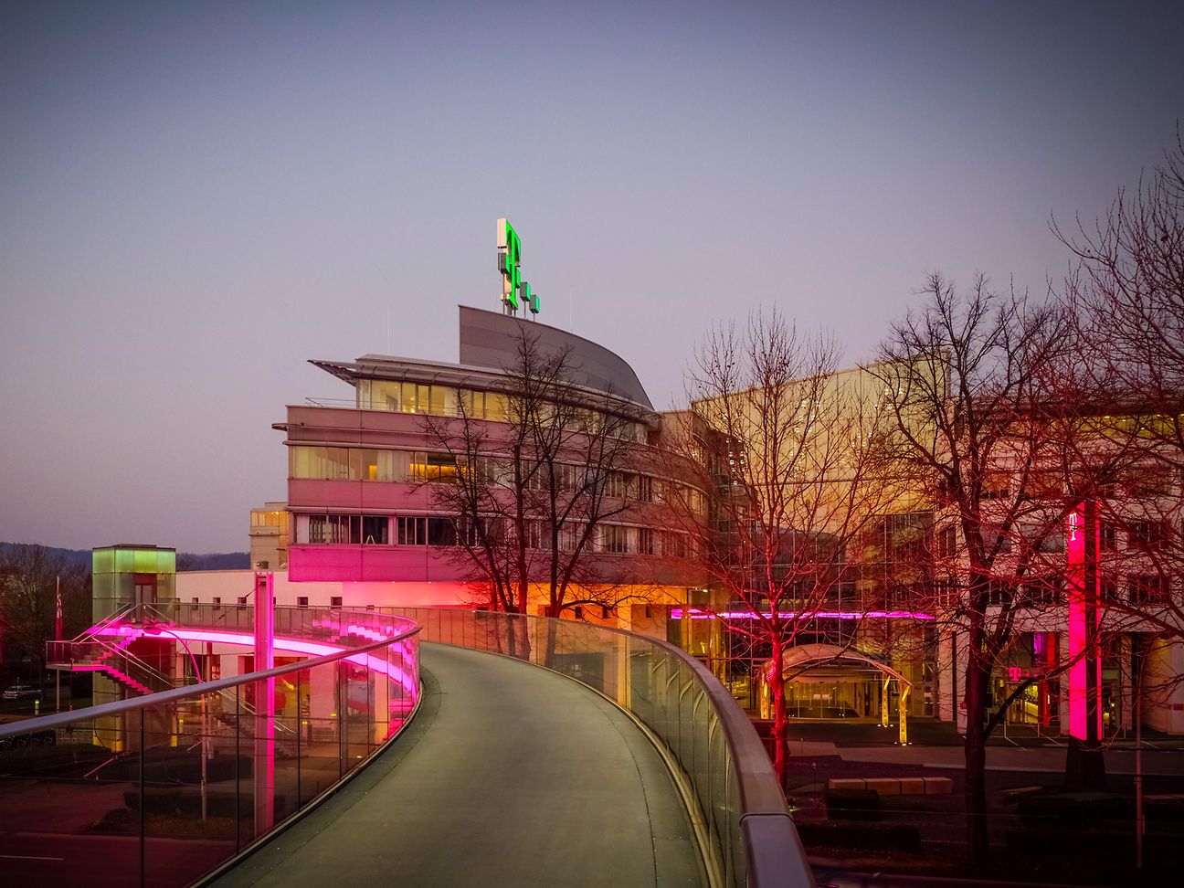 Das T auf dem Dach der Bonner Telekom Zentrale leuchtet grün.