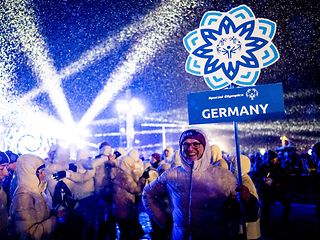 Lächelnder Mann in Winterklamotten hält ein Schild mit dem Logo der Special Olympics Winterspiele und dem Schriftzug ‚Germany‘