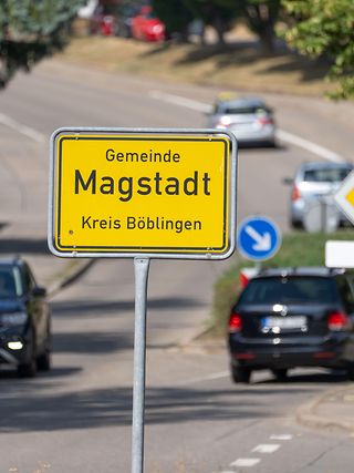 Gelbe Ortseingangsschild von Magstadt, im Hintergrund eine belebte Straße.