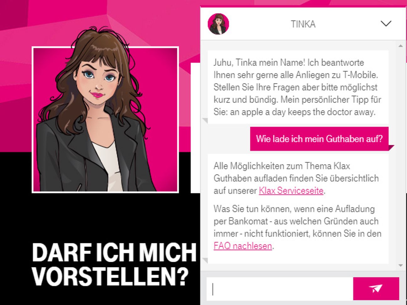 "I would like to order an iPhone 7" and "My bill seems too high" are just two of the some 2,000 questions Tinka receives every day from T-Mobile Austria customers. Tinka appears as a small illustration depicting a young lady along with a blank box for text input from customers or prospective customers. Tinka forwards the remaining issues to live chat with a human advisor, or to the customer forum, or – if required – to the online cell phone help desk.