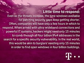 In the digitalization age, damaging attacks on companies and other organizations can be mounted even by people with little technical know-how. What's more, even organizations that invest heavily in IT security can fall victim to hacker attacks. Today's hackers and spies profit from three key factors. First, organizations often fail to maintain a proper overview of the IT systems they have in place. Second, more and more security vulnerabilities are being published. Third, it's now possible to massively exploit security vulnerabilities within a matter of hours. (See the photo show below.)