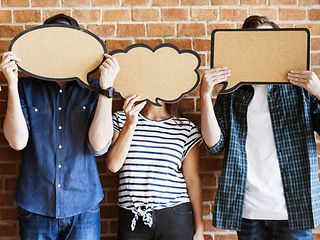 The picture shows 3 people holding empty speech and thought bubbles in front of their faces.
