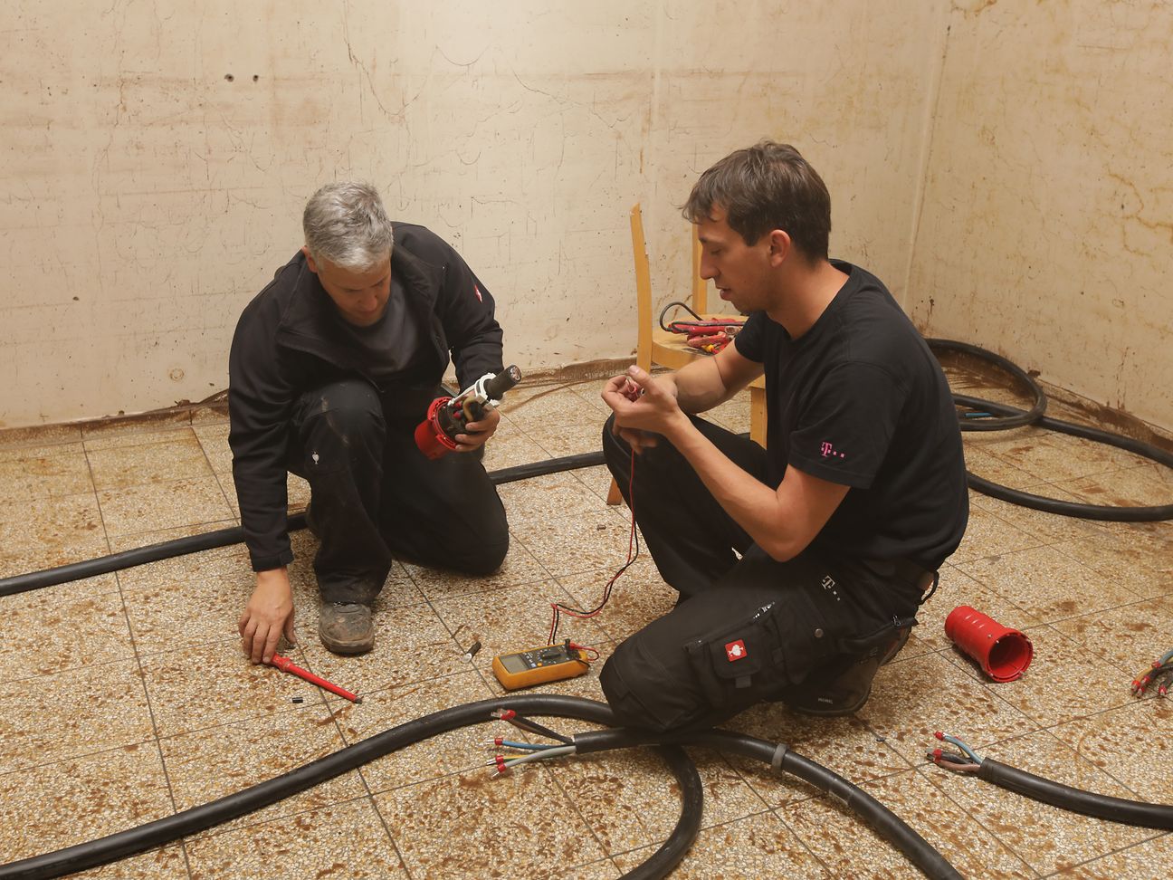 In the basement of the Gerolstein switching station, which is an important hub in the region. The water has already been pumped out and the mud removed. Jens Thees (left) and his colleague Mathias Mergens establish the power supply line from the feed-in point of the local power supplier to the mobile replacement equipment, the Save-T container.