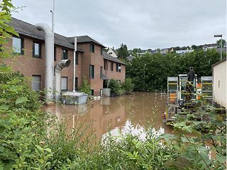 Thees continues on to Gerolstein. There, a large Deutsche Telekom switching station is under water, a so-called "K-VSt" (Kontrollvermittlungsstelle, control switching station). It is not only Gerolstein that is supplied from here. This important hub is also connected to other smaller operating stations with a total of 16,000 households and around 200 companies as far away as Saarland. In addition, 36 mobile communications sites are connected.