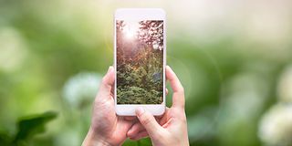 Two hands holding a smartphone displaying a green forest on its screen