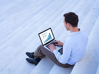 Mann mit Laptop sitzt auf Treppe