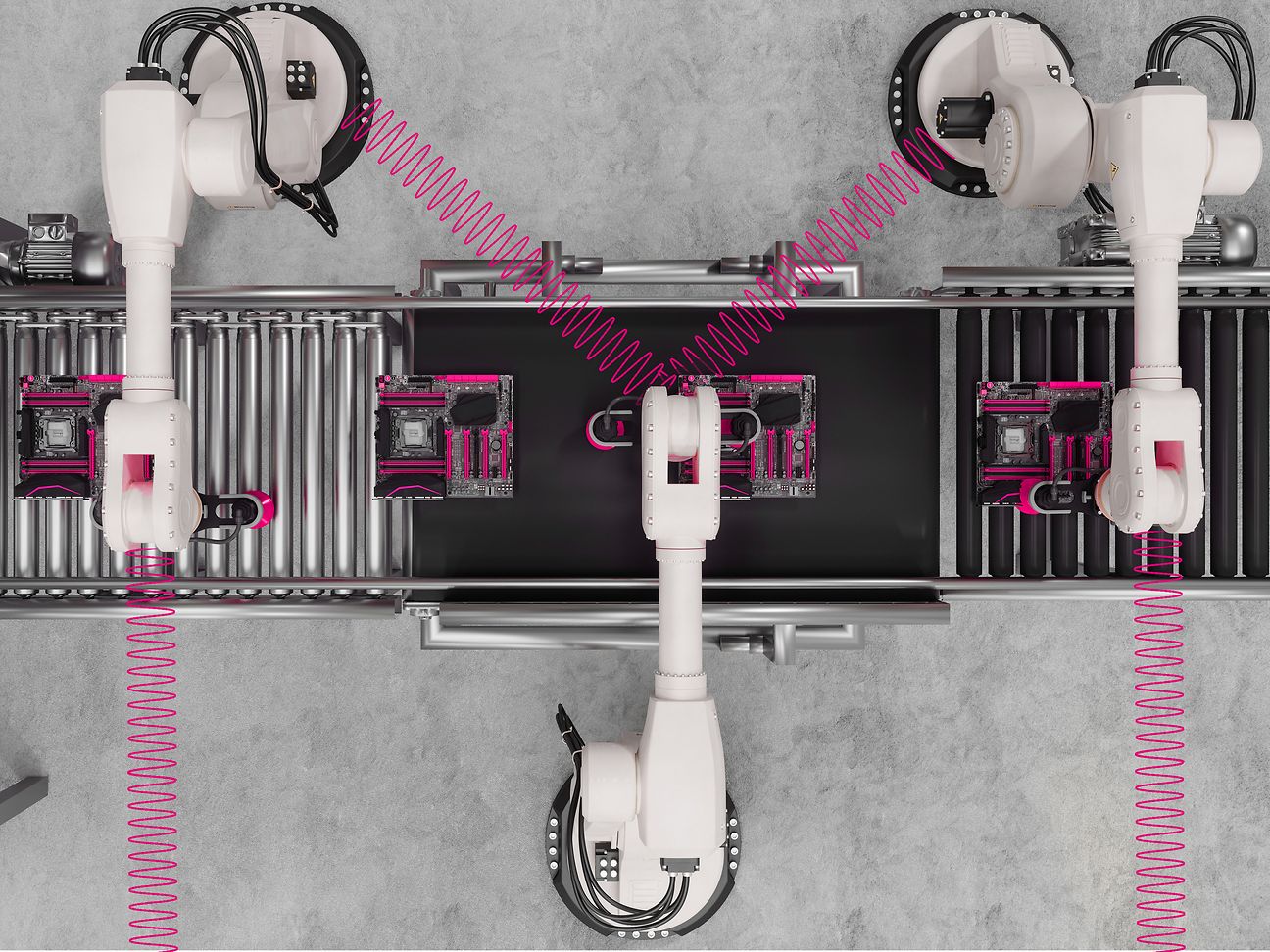 5G-Millimeterwellen eignen sich besonders für datenintensive Anwendungen - beispielsweise in der Fertigungsindustrie.; © Bildnachweis: Deutsche Telekom/ iStock/onurdongel; Montage: Evelyn Ebert Meneses