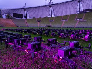 A light show with 300 drones is an orchestrated spectacular that primarily relies on the design, software and hardware. Using a special GPS signal, the drones will fly a pre-programmed choreography. They are controlled by specially trained pilots. Flight formations, pictures and words are planned in advance using a 3D animation program.
